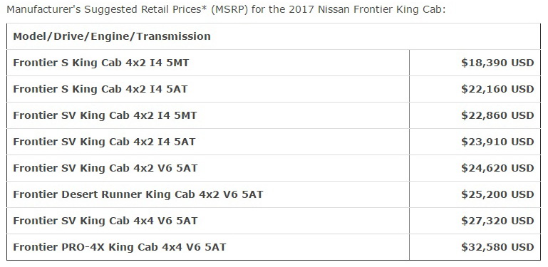 Pricing for the new 2017 Nissan Frontier starts at $19,330 for the 4×2 four-cylinder King Cab manual, while Crew Cab models begin at $24,840 for the 4×2 V6 manual S.