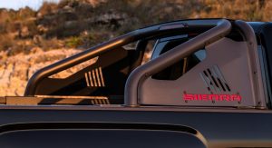 Visually, the All Terrain X stands out thanks to its 18″ black-painted aluminum wheels, 275/65R18 Goodyear Duratrac MT-rated tires, unique body-color grille surround for the All Terrain insert, body-color door handles and body side moldings, Black power-adjustable heated and power-folding mirrors with integrated turn signals, LED rear guidance lamps and LED amber clearance lamps, black belt moldings, 4″ black sport side steps, and a black sport bar mounted in the bed.
