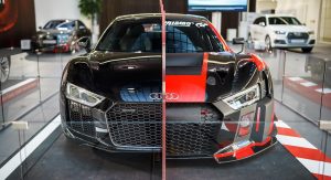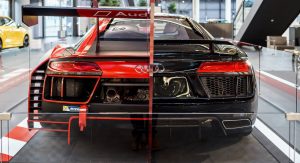 As you can see, the entire passenger side is derived from a standard Audi R8 Coupe V10 plus, whereas the driver’s side comes from the R8 LMS race car.