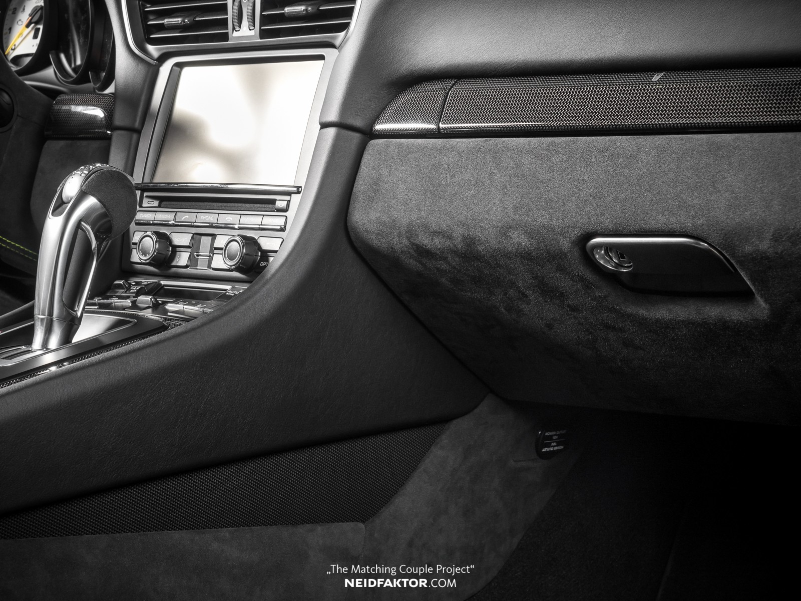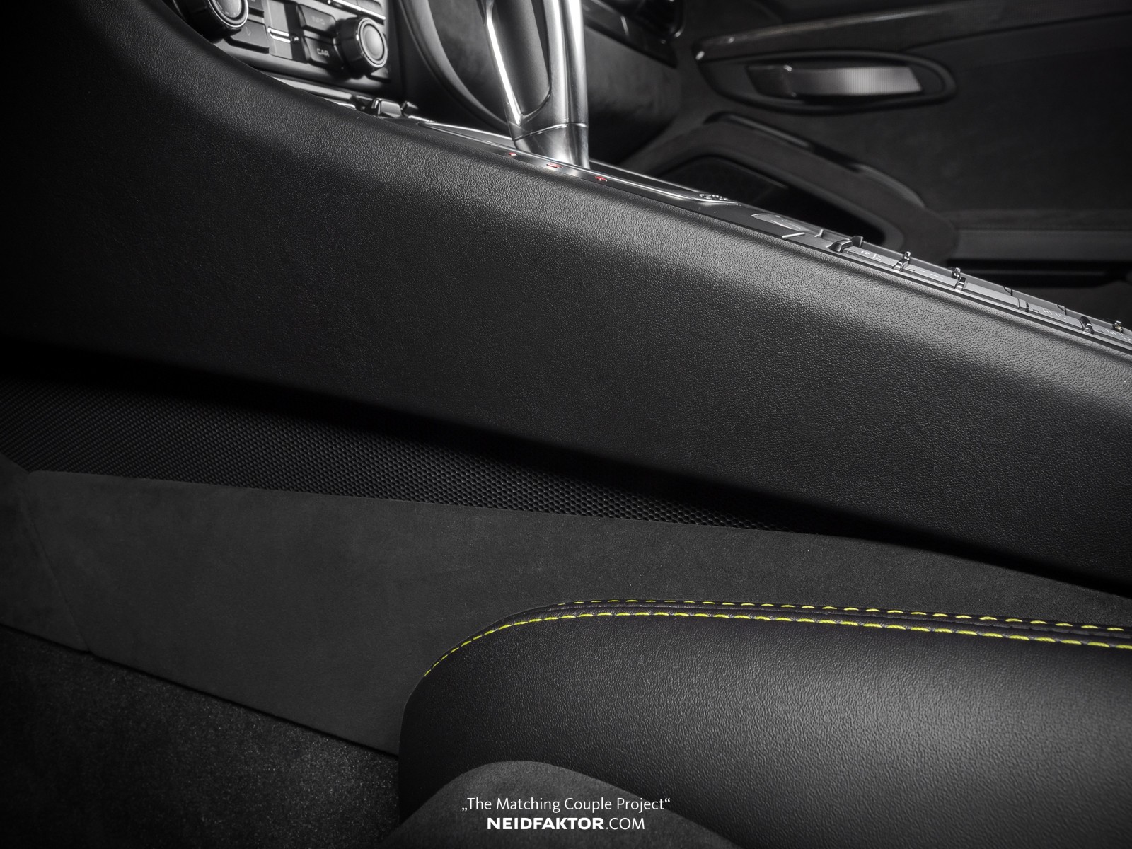Additionally, there are numerous black leather components to provide the car with some added luxury while the Acid Green contrast stitching is enough to make a 918 owner envious. A custom carbon fiber, three-spoke steering wheel with Ferrari-inspired shift lights has also been installed.