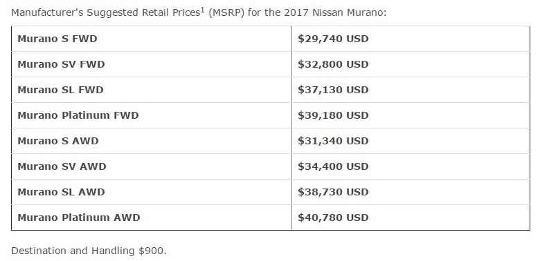 Nissan has announced pricing for the MY2017 Murano SUV, which starts from $30,640.