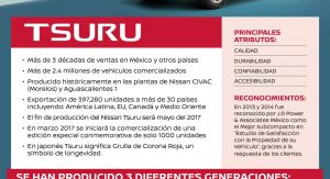 “In the Mexican automotive industry, Tsuru is one of the top sales leaders. The majority of Mexicans have some history that binds us to the Nissan Tsuru. The sedan, which has a huge following, has provided families in Mexico high-quality, reliable and durable transportation since 1984”, said Mayra Gonzalez, president and general director, Nissan Mexicana.
