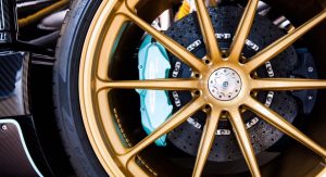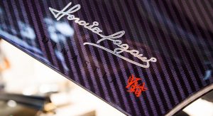 Beyond the bold exterior, the cabin of the car is also rather amazing with bright turquoise leather and stitching as well as black alcantara and numerous carbon fiber parts.