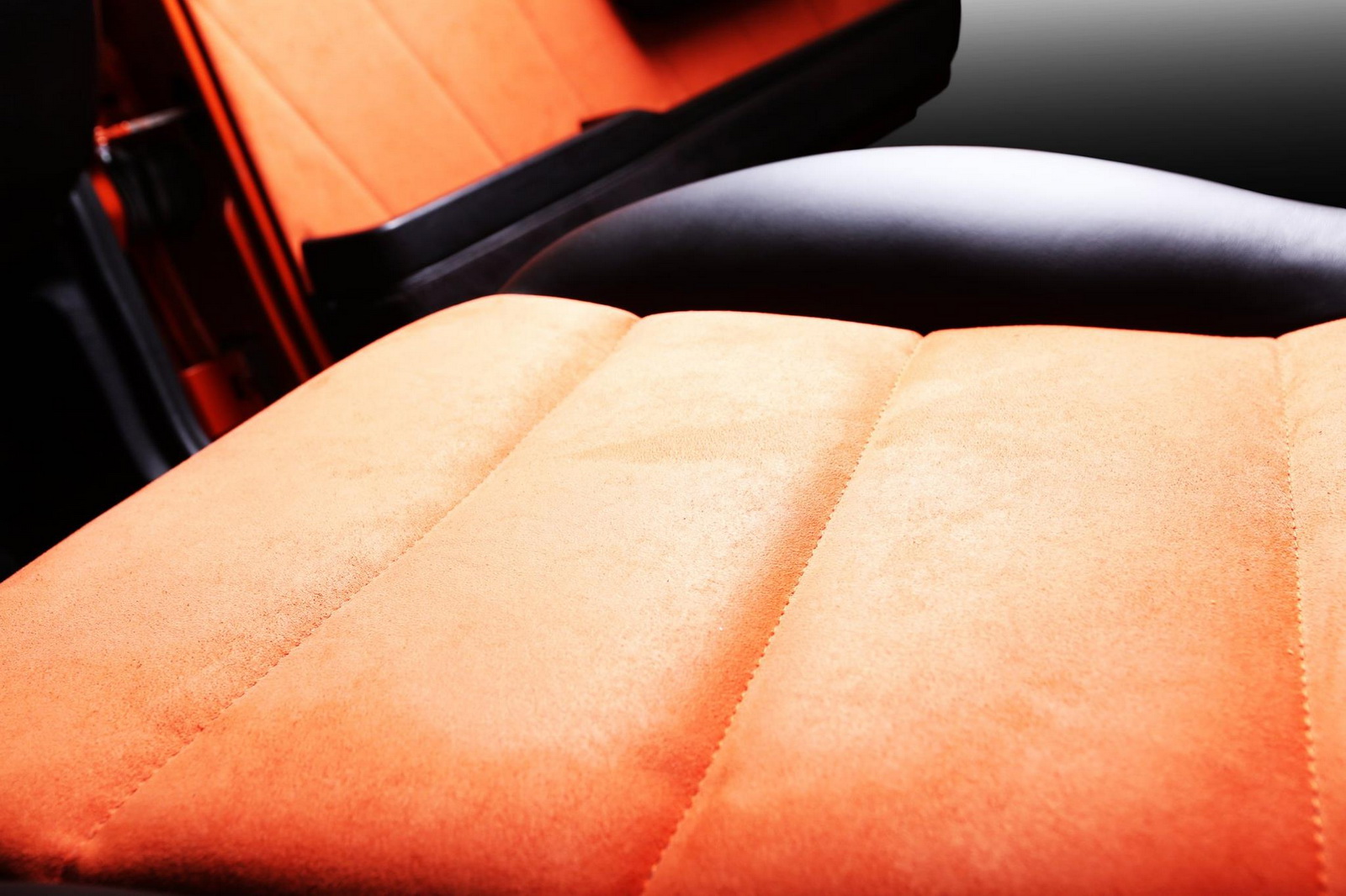 The Audi’s cloth interior was completely upholstered in custom, handcrafted leather, and Alcantara complemented by decorative stitching. According to Carbon Motors, the Lava Orange exterior paint job was matched with a black and orange combination at the interior.