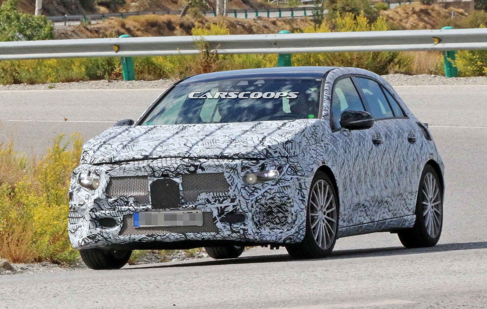 Look closely and you will spot underneath all this heavy cladding a big additional air intake in the left corner of the front bumper. Add to that a set of bigger, drilled brake discs and a pair of visible exhaust pipes that emitted a deeper sound, according to our spies, and you will realize that this is something much hotter that a regular diesel A-Class.
