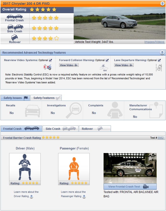 The feds’ five-star safety rating follows a Top Safety Pick+ scored from the Insurance Institute for Highway Safety (IIHS) by the 2016 Chrysler 200 and only applies to the front-wheel drive variations of the car, as the AWD hasn’t been tested.
