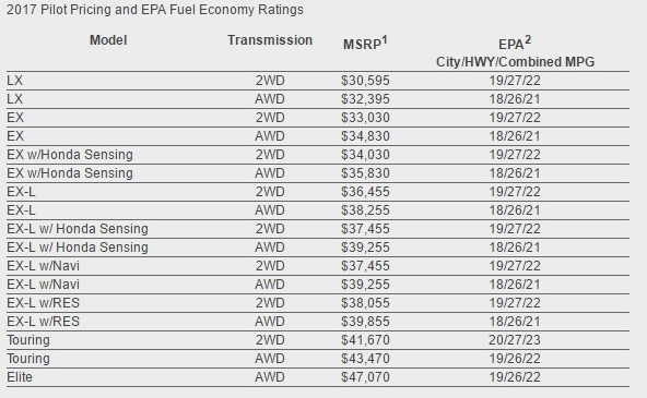 Pricing for the 2017 Honda Pilot kicks off at $30,595 for the 2WD LX model, with the AWD LX costing from $32,395.