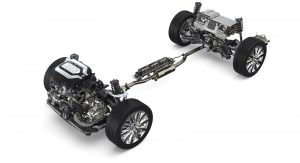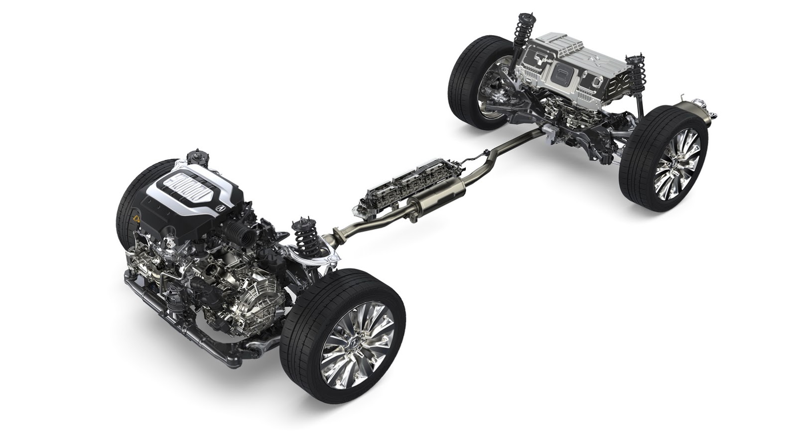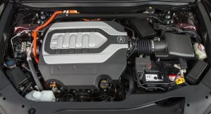 The power unit is a direct-injected 3.5-liter 310 HP V6 with a 7-speed dual-clutch transmission (DCT), a built-in motor-generator powering the front wheels and two rear electric motors for the rear wheels. Its combined power output is 377 HP, whereas its EPA rating is 29/30/29 mpg (city/highway/combined).