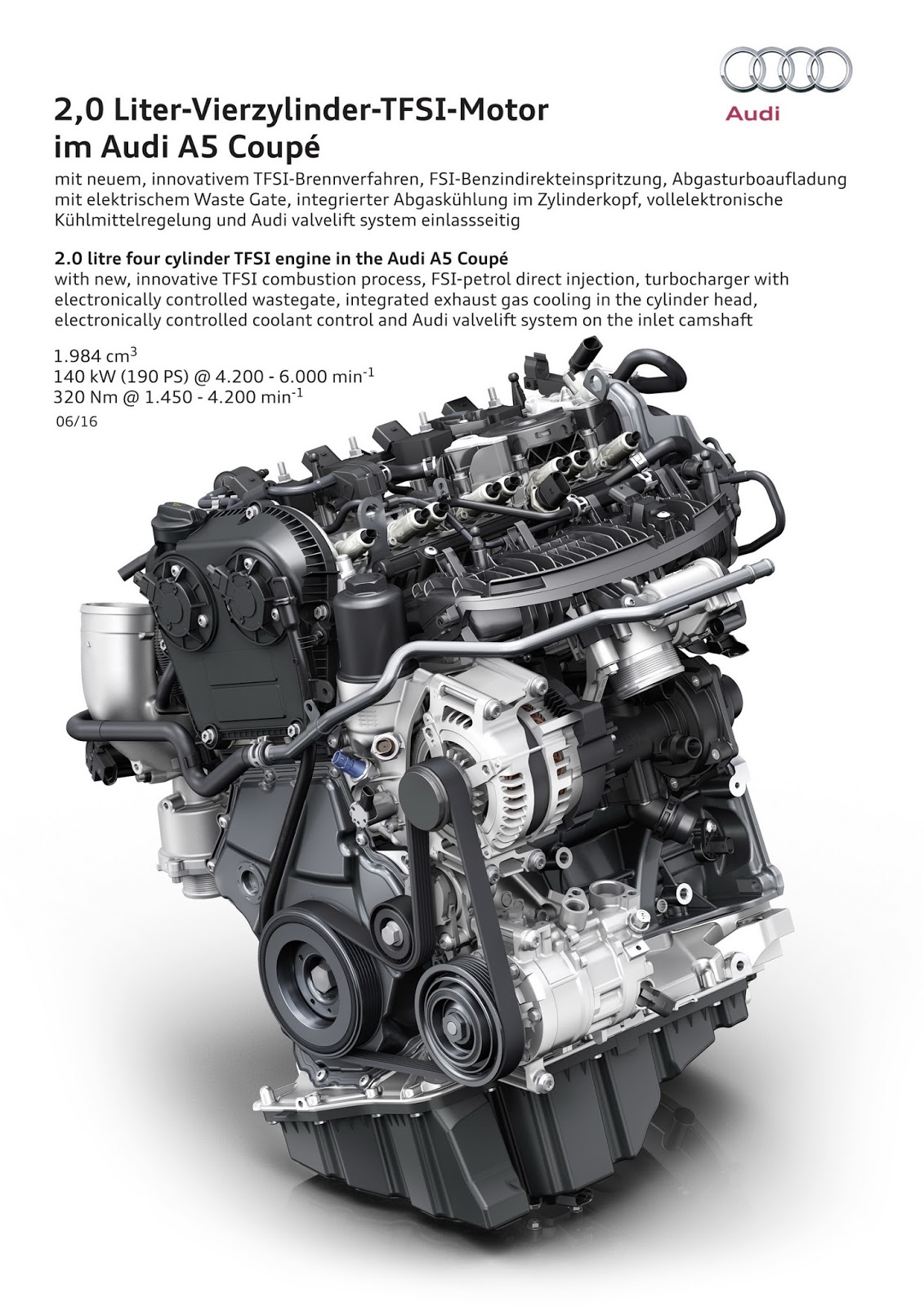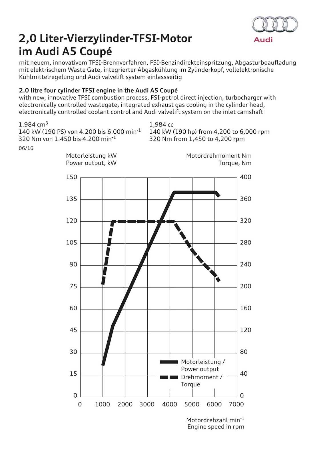 In terms of powertrains, A5 Coupe models are equipped with a 2.0-liter TFSI four-cylinder petrol engine, coupled with either a seven-speed S tronic dual-clutch automatic gearbox or a six-speed manual transmission. These engines put down 252 HP and 273 lb-ft (370 Nm) of torque, accelerating the automatic A5 from 0 to 60 mph (96 km/h) in 5.6 seconds with the manual version requiring an extra 0.1 seconds.