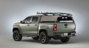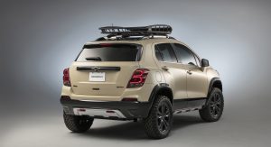 The smallest of the trio is the Trax Active concept. Based on GM’s tiniest crossover, the show truck has been prepped for the dunes with a lifted suspension and wider track, fitted with 18-inch wheels and all-terrain rubber. The front and rear bumpers have also been reprofiled to improve the vehicle’s approach and departure angles, while a Thule roof rack gives it more cargo capacity and a place to mount the LED auxiliary light bar. The whole thing is painted in a suitably marshal shade of matte beige, with carbon trim, red tow hooks, and a jet-black interior.