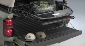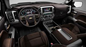 Still too small? There’s a custom Silverado 1500 as well. This truck highlights the factory High Desert package, but takes a sleeker, less militaristic approach than its more diminutive counterparts. The package brings Chevy’s Magnetic Ride Control suspension to the Silverado for the first time and includes a lockable, flexible bed cover. The show truck is further enhanced with performance exhaust and brake kits and upgraded trim, as well as 22-inch wheels in a bronze finish to complement the interior and offset the dark blue bodywork.