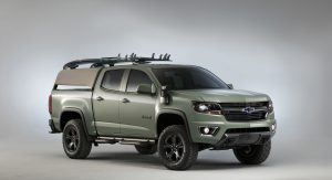 Too small? The Trax is joined by a Colorado pickup that looks no less combative with its green paintjob, but has actually been designed by Hurley with surfers in mind. It’s based on a Colorado Z71 Crew Cab, and features a similarly lifted suspension, with 17-inch wheels and off-road tires. But where it departs is with the roof-mounted surfboard rack, wetsuit drying rack, and nautical bed tarp. The earth-tone interior is upholstered in quick-drying neoprene, with Hurley logos inside and out.