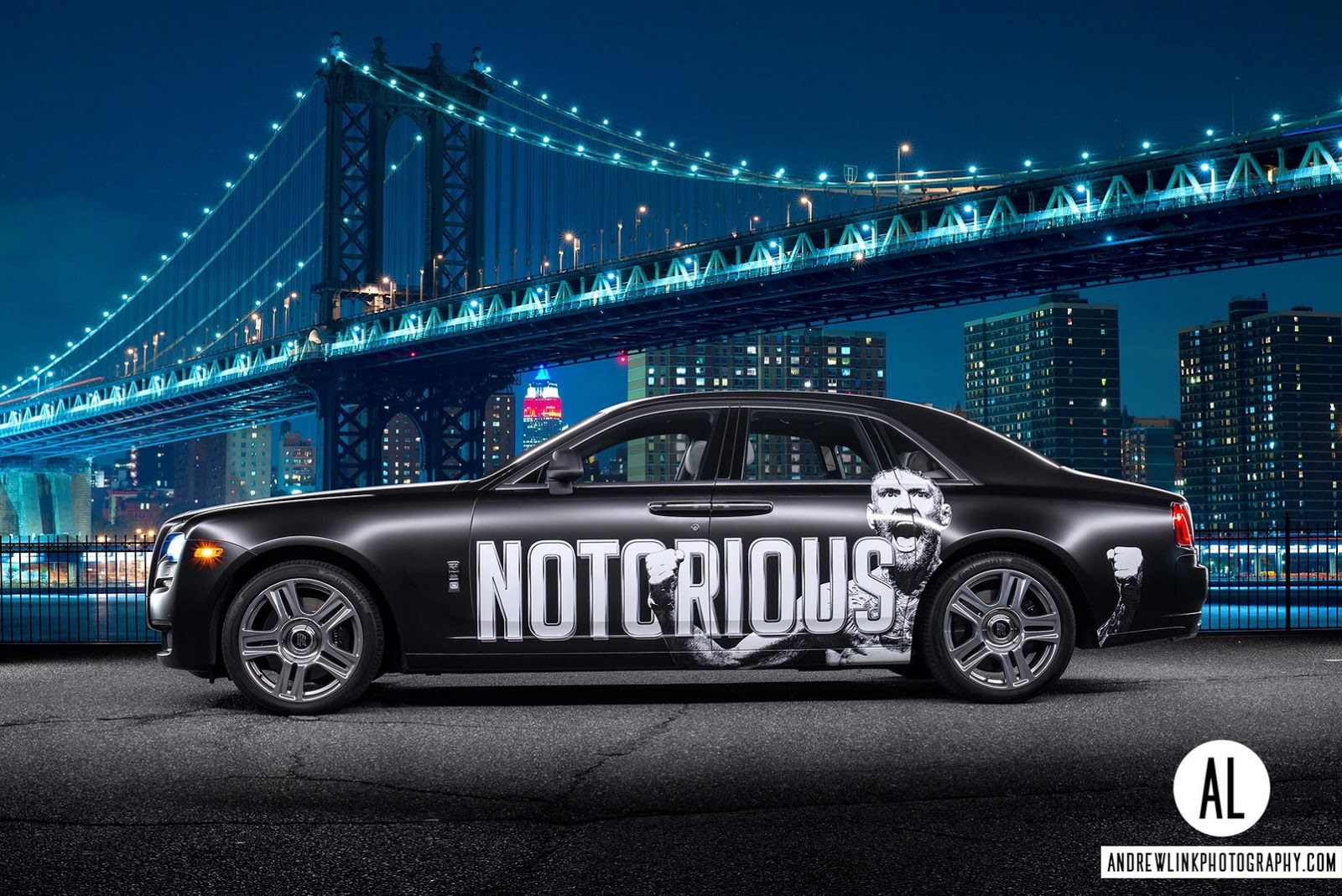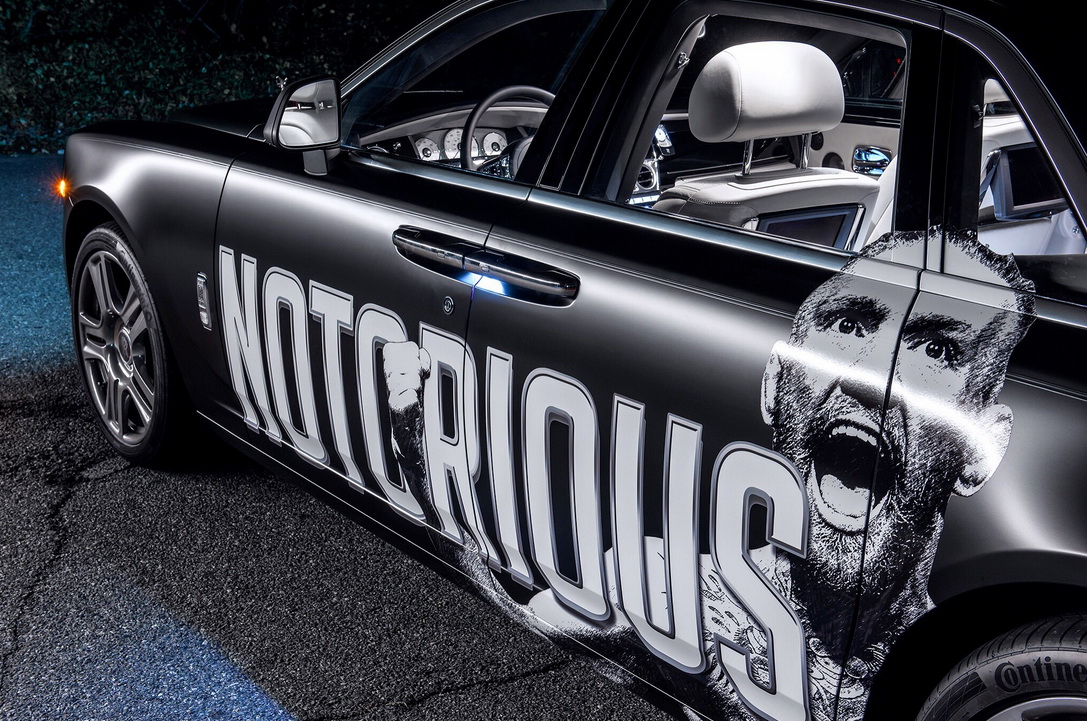 Ahead of the event, Rolls-Royce Motor Cars North America shared a few images of McGregor’s customized Ghost, featuring a matte black exterior, white leather interior and a large ‘Notorious’ decal on the side, featuring the man himself.