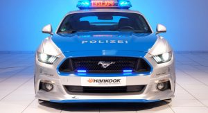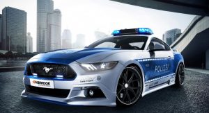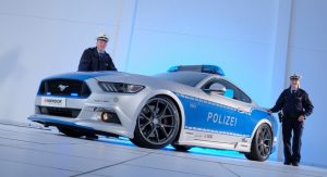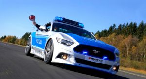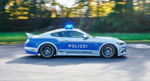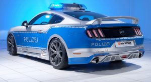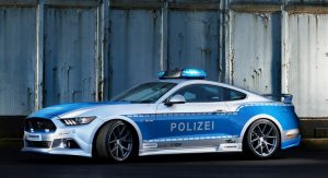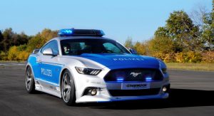 As with every year, the car has been adorned in a local ‘Polizei’ livery that includes bright blue decals on top of the silver paint scheme. Additionally, the Mustang has been fitted with a new body kit, a set of black wheels matched to incredibly low-profile tires and height-adjustable coilovers.