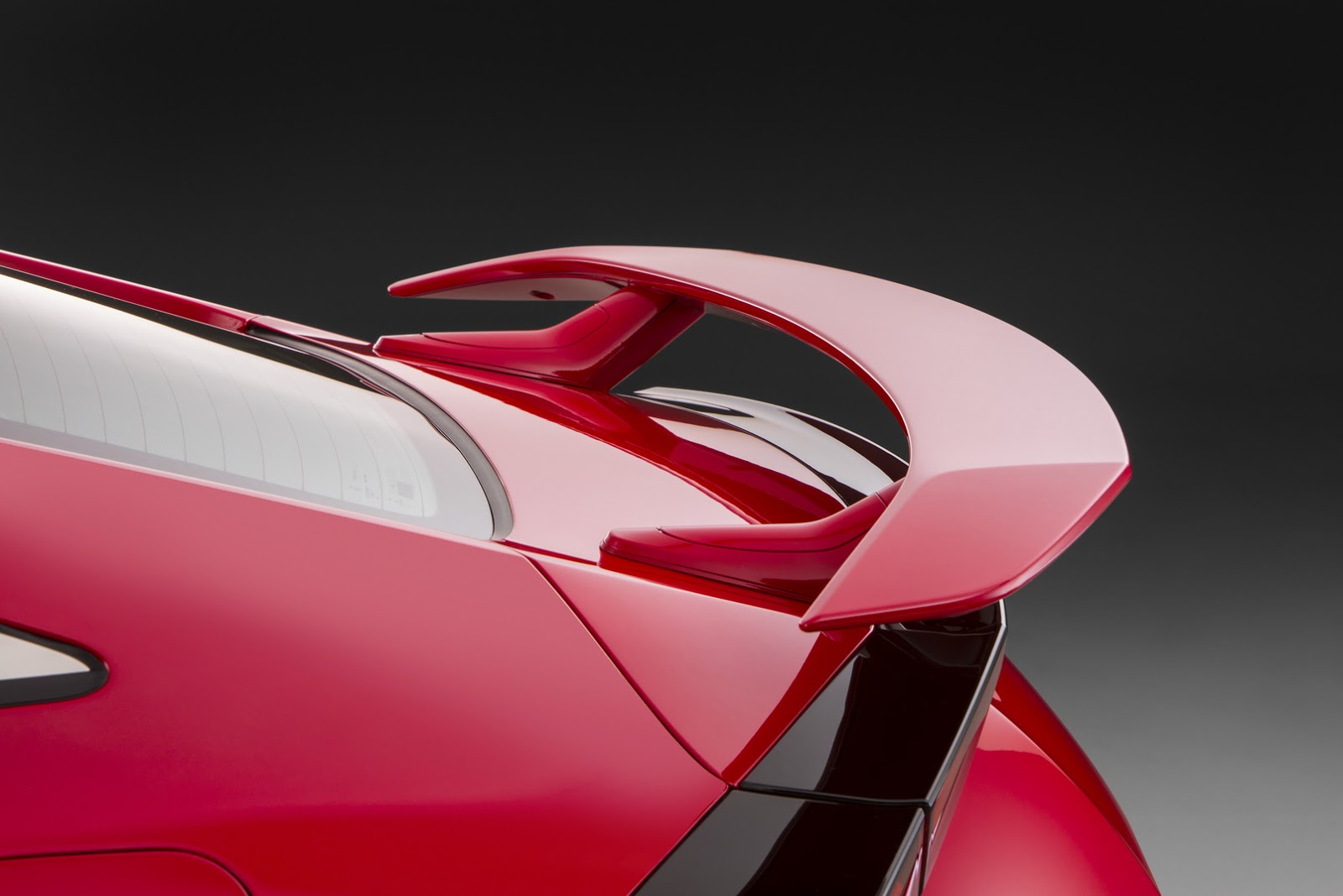 From the outside, the Prototype adopts a bold new design compared to regular Civic models. Most notably, the front fascia has been heavily revised and includes enlarged air intakes, a black lip, black grille and new fog lights. Other styling changes include a set of eye-catching wheels, a fixed rear spoiler, central-exiting exhaust and a bright paint finish dubbed Rallye Red Pearl.