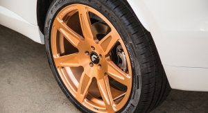 The set in question here belongs to Forgiato and these Brushed Gold wheels are called Esporre-M Monoleggera, featuring a seven single-spoke design and measuring 22″.