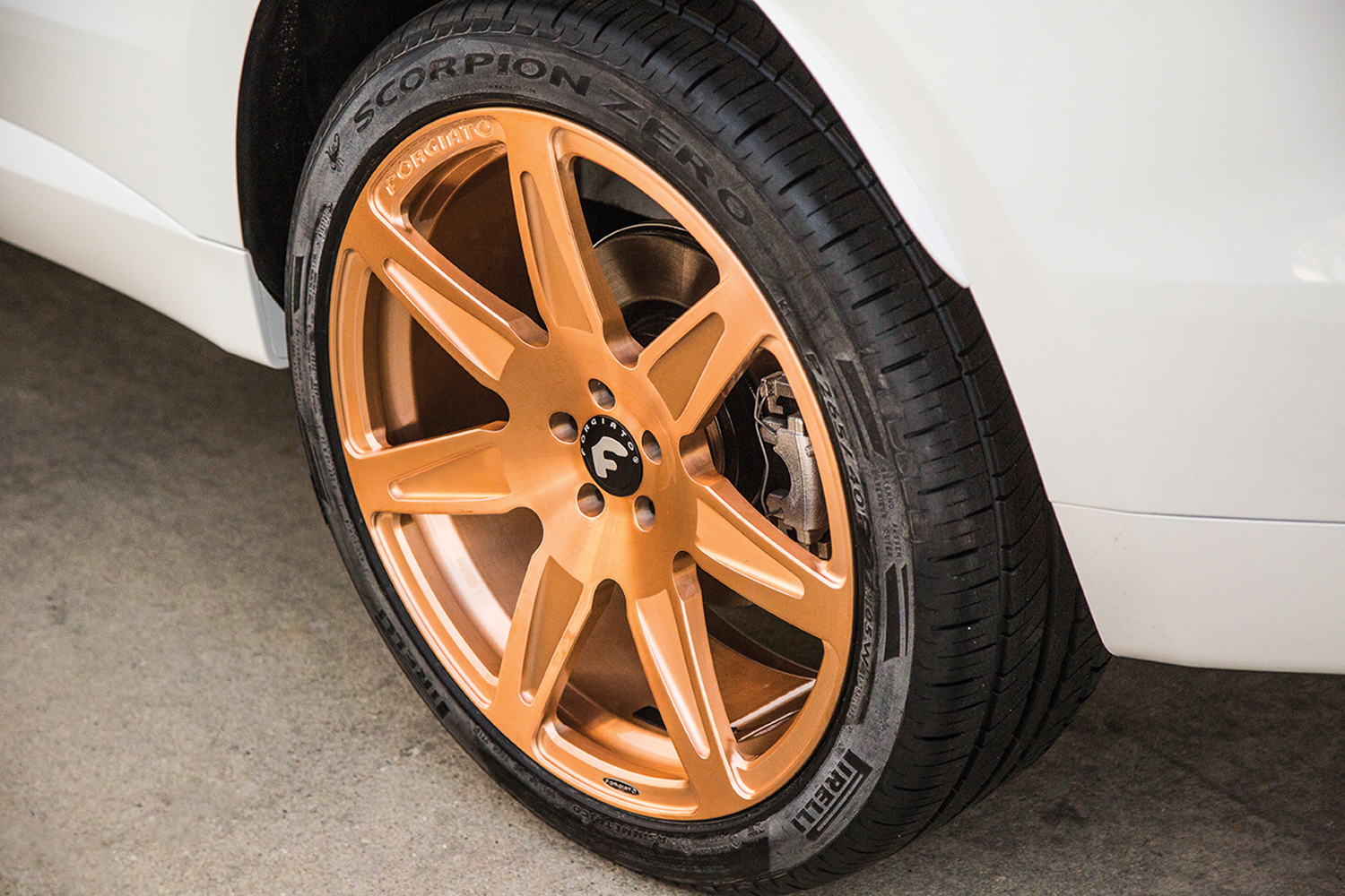 The set in question here belongs to Forgiato and these Brushed Gold wheels are called Esporre-M Monoleggera, featuring a seven single-spoke design and measuring 22″.