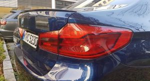 Sure enough, you’ve got the xDrive badge and the 550i inscription at the back, both covered in vinyl, and a small patch of camouflage on the sides to cover the M logo, which is curiously missing from the rear. By the way, the exterior color is called Mediterranean Blue Metalli.