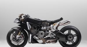 The powerplant develops 215 hp @ 11,000 rpm making it the most powerful (factory) twin-cylinder ever built. It also features titanium con rods, sand-cast crankcase, and an all-titanium Akrapovič exhaust with high-mount dual silencer.