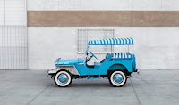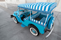 All done up in teal with white-striped upholstery, it has a roof that looks like it was lifted from an ice cream parlor, and place to mount surf boards or bicycles on the front. It’s deliciously retro and anything but subtle.