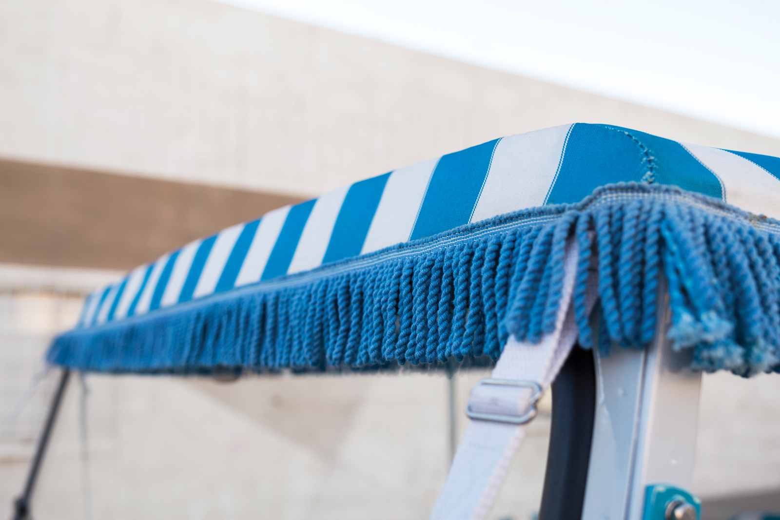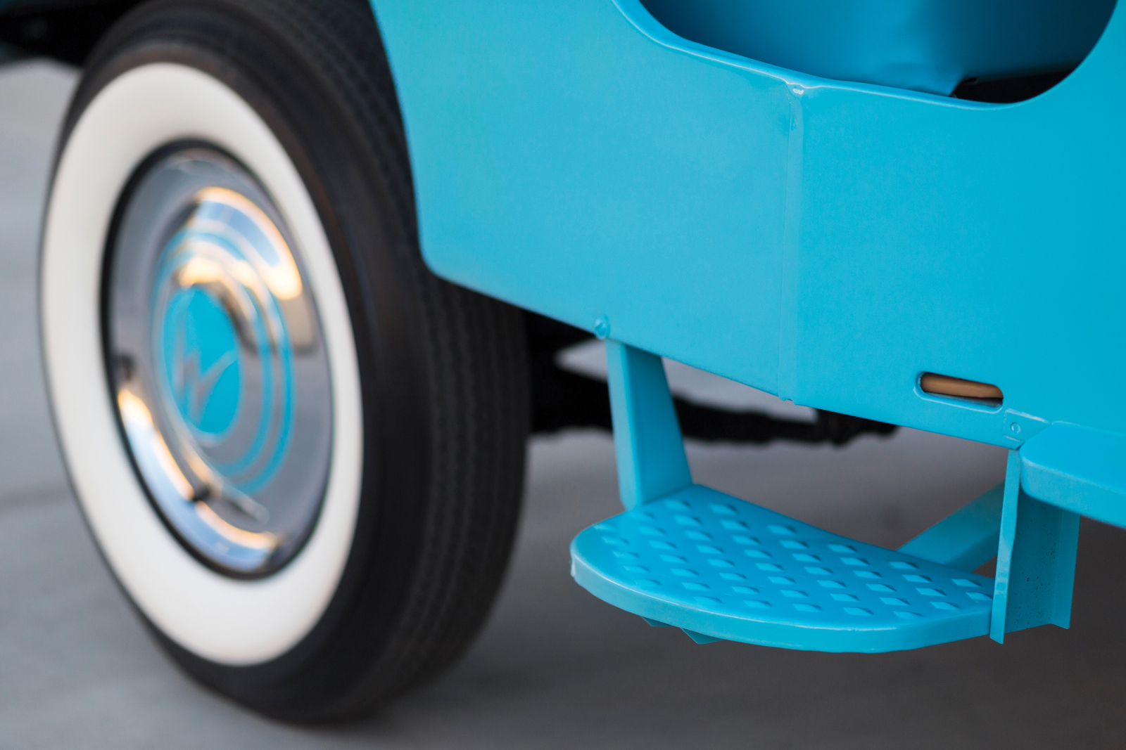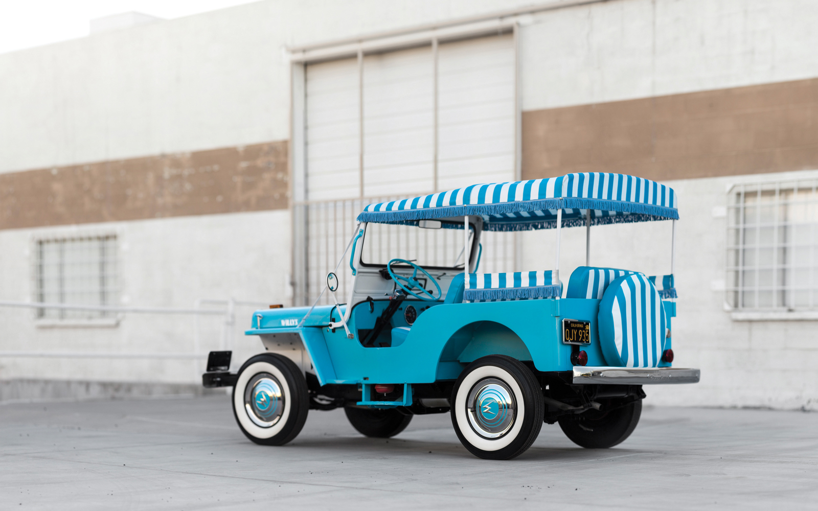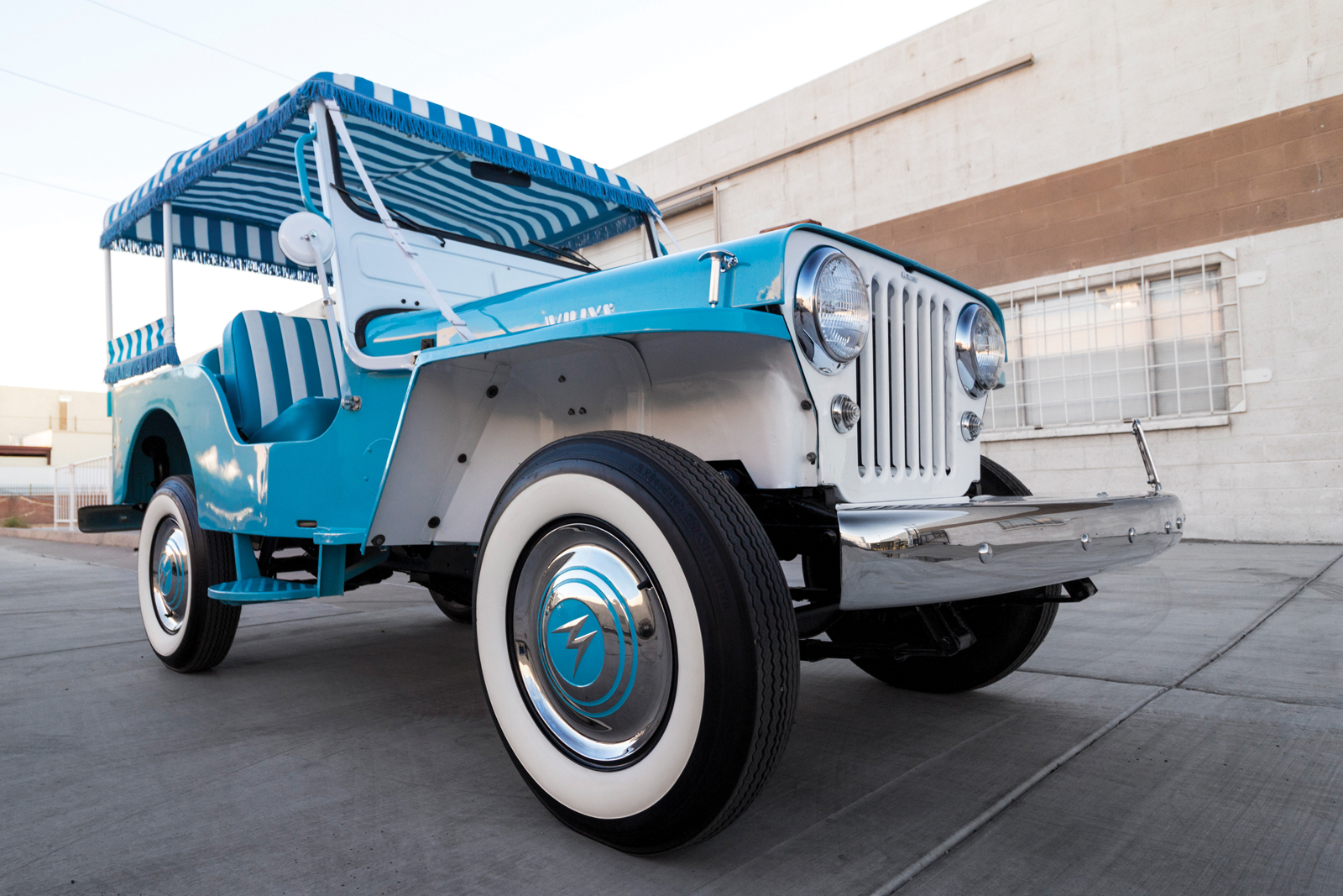 All done up in teal with white-striped upholstery, it has a roof that looks like it was lifted from an ice cream parlor, and place to mount surf boards or bicycles on the front. It’s deliciously retro and anything but subtle.