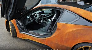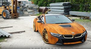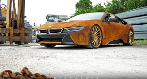 While we’d feel rather obnoxious and self-concious driving around an i8 that looks like this, the rust effect has at least been complemented by a bright set of gold wheels from Vossen Wheels.