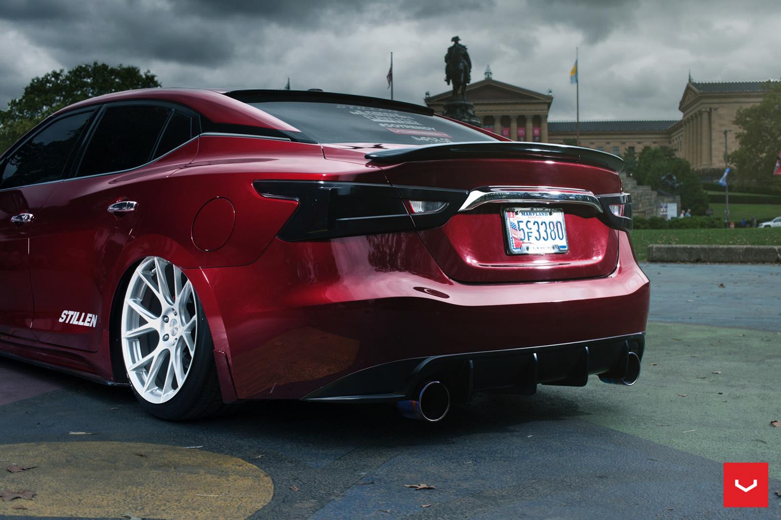 Aside from everything that generally helps the Maxima stand out in a crowd, this particular car has been lowered and placed on a set of large Vossen VFS6 wheels.