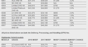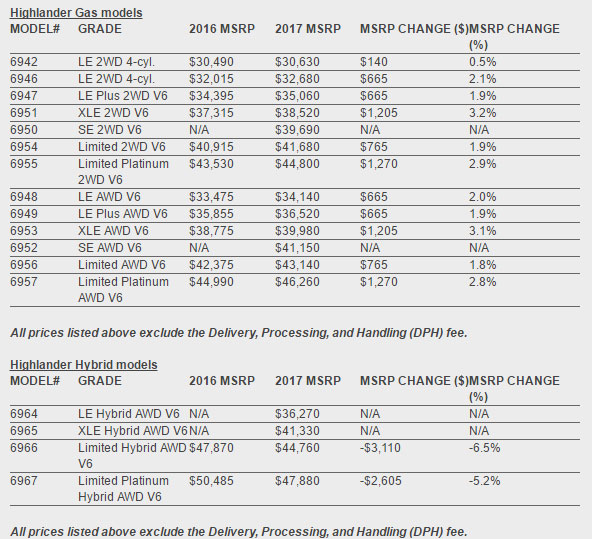 Pricing details for U.S.-bound 2017 Toyota Highlander models have been announced just before the model reaches dealerships in mid-November.
