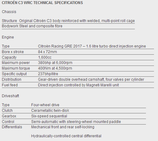 For the 2017 season, the Citroen Total Abu Dhabi WRT will feature between two and four C3 WRC cars for its crews, made up of the following pairings: Kris Meeke/Paul Nagle, Craig Breen/Scott Martin, Stéphane Lefebvre/Gabin Moreau and Sheikh Khalid Al Qassimi/Chris Patterson.