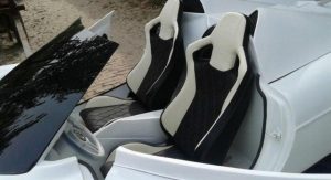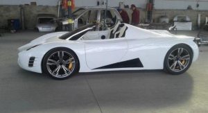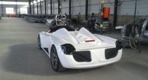 The body of the vehicle is made from fiberglass and tips the scales at just 200 kg (440 lbs). As for its design, well, the headlights are obviously inspired by the Huayra and the six-taillight design of the Huayra has also been mimicked, only instead of lights, they are fake exhaust pipes. In the cabin, things are very basic with a totally plastic dashboard, a steering wheel without an airbag and a small touchscreen.