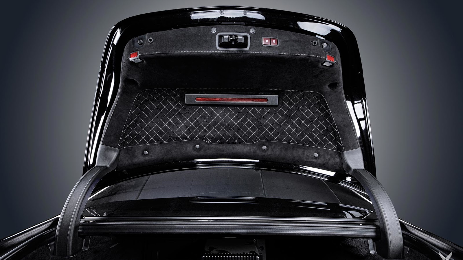 Additionally, the interior includes a fitting amount of black alcantara, including on the steering wheel and parts of the headliner. Other custom touches include Piano Gloss Black accents instead of the standard wood trim as well as a trunk bathed in alcantara.