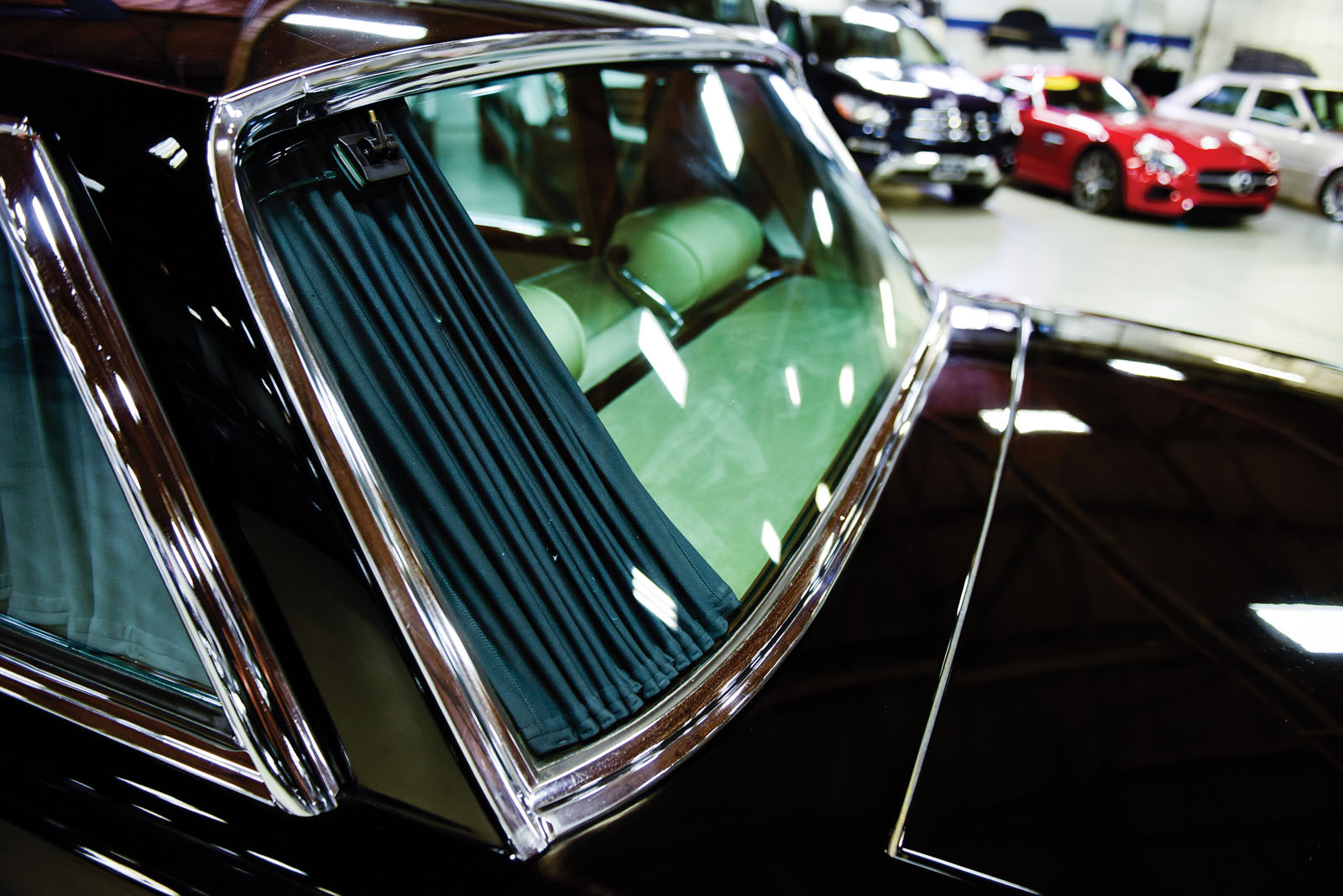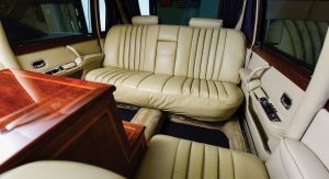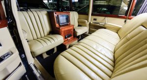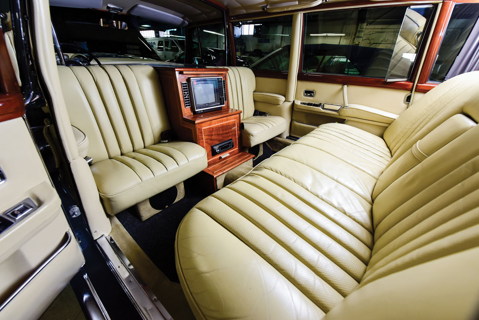 This particular example features a black exterior and beige interior, complete with cherrywood back-seat console housing a Sony television and Panasonic stereo.
