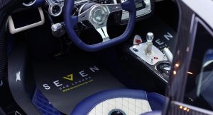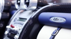 Inside, it is bathed in gloss carbon fiber, aluminium and white and blue leather and is surely one of the most beautiful cabins ever designed.