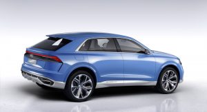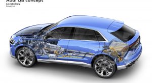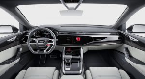 Though its more streamlined roofline leaves the concept with ample room for only four occupants inside, the Q8 is actually longer and wider than the second-generation Q7 introduced at the same show two years ago. The concept also much more aggressive visually, its oversized octagonal grille capping a more couple-like form, with frameless windows, muscular shoulders, and 23-inch wheels packing 20-inch ceramic brake rotors in the grandest of show-stopping style.