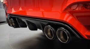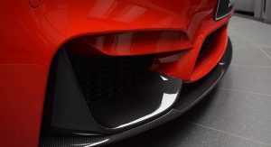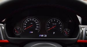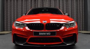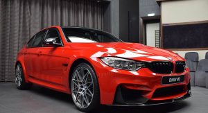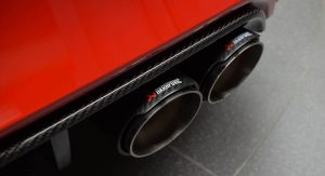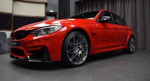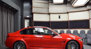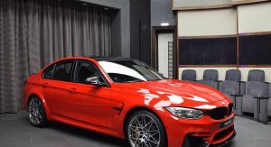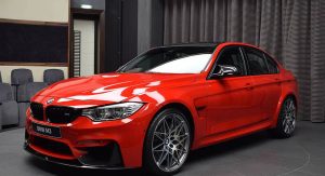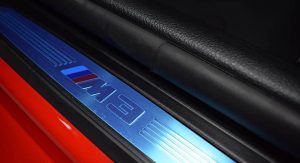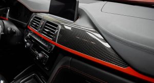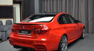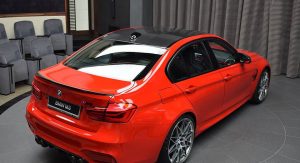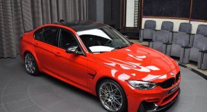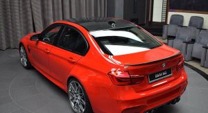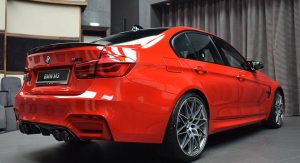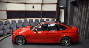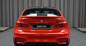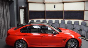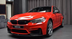 This M3 has also been equipped with M ceramic brakes and the available M Performance aerodynamic kit that includes a bold front fascia, a small bootlid lip spoiler and carbon fiber mirrors. It’s then been fitted with a carbon Akrapovic rear diffuser and an Akrapovic Evolution exhaust system in place of the already-upgraded M performance system.
