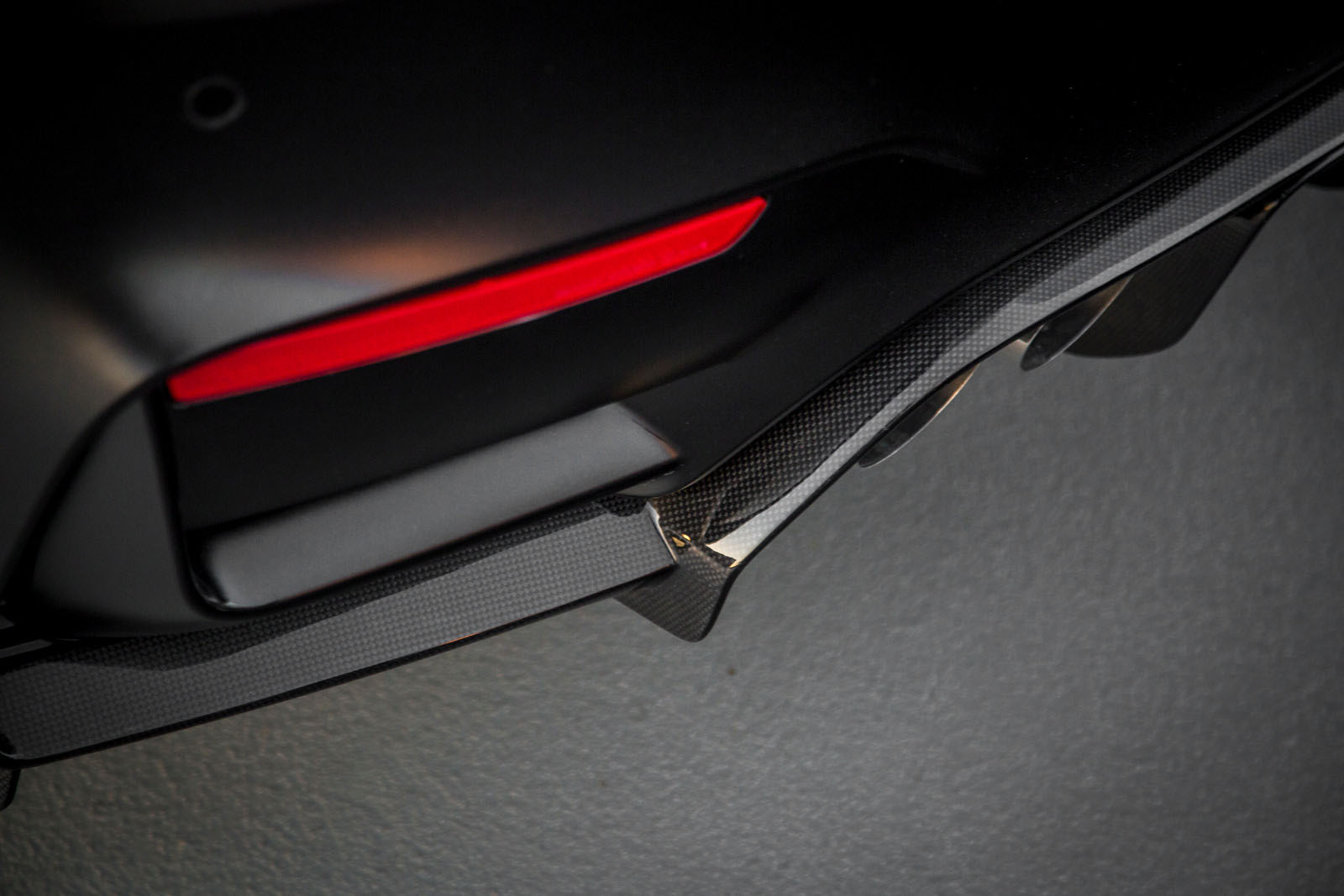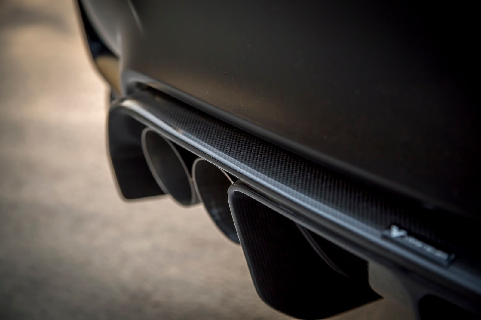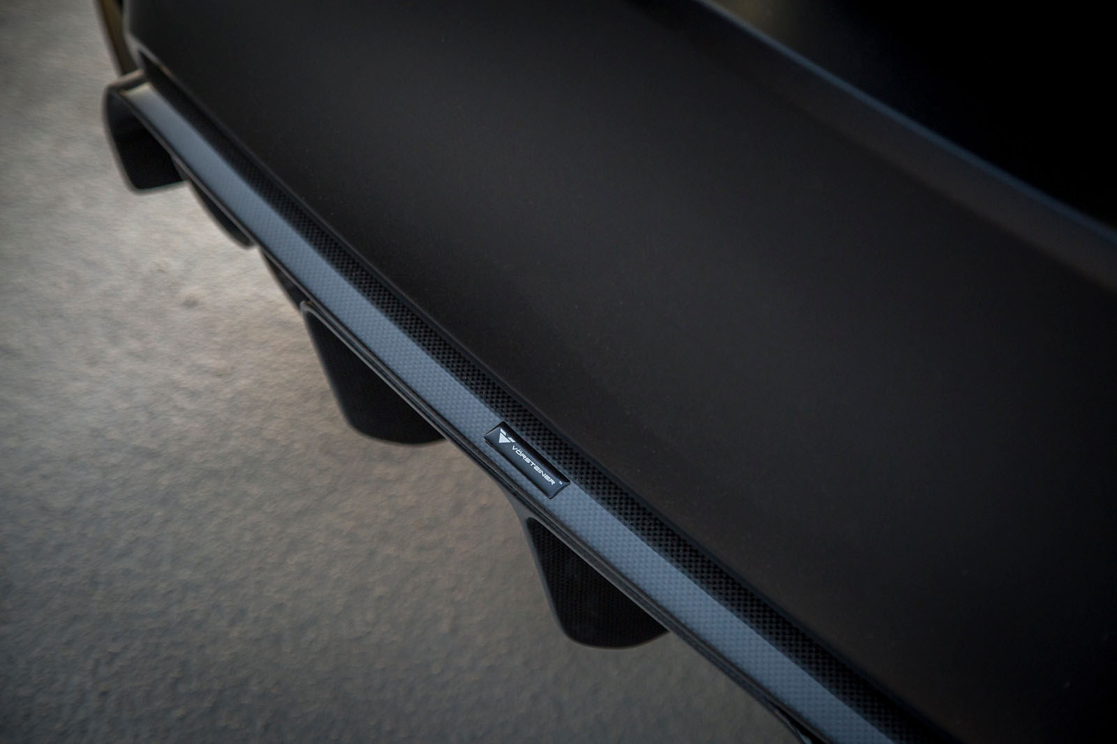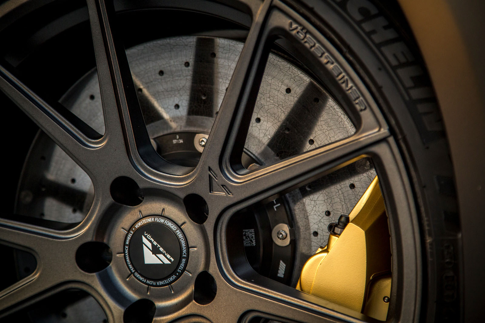 This example, however, has been outfitted by Vorsteiner with its own set of V-FF 106 wheels. Made of carbon graphite, they measure the same 19 x 9.5 inches at the front and 19 x 10.5 inches at the rear as the stock set. But these do without the orange trim that the factory fits to match the front lip spoiler, complementing the matte black body finish for an even more sinister look.