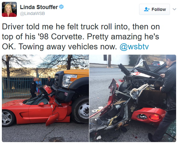 According to WSB-TV’s Linda Stouffer, the driver of the sports car was OK, although he did tell her about how he felt the truck roll into his car, which must have been a scary sight considering how low the Corvette is compared to that truck.