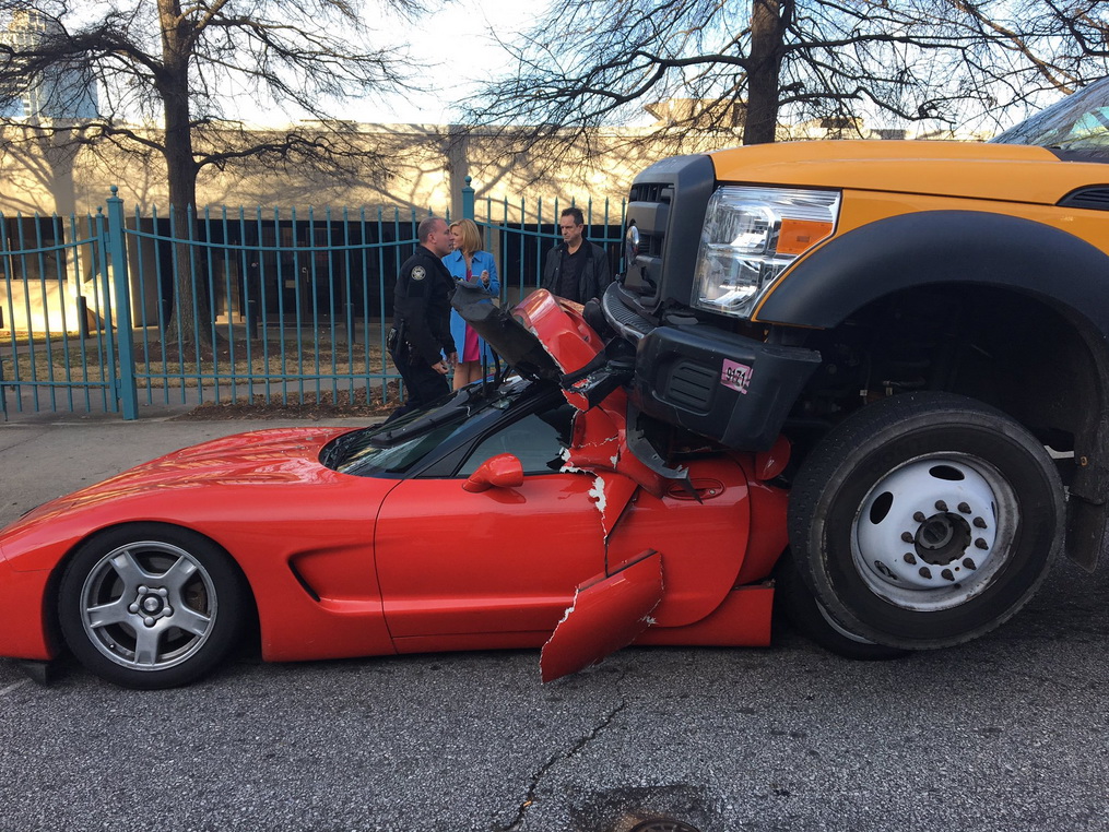 This incident took place earlier this week in midtown Atlanta, where a Ford truck owned by the city crashed into, and went over top of this fifth-generation Vette.