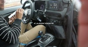 Even though the dashboard is partially covered by some type of mesh, we can still see right through it to catch a glimpse of the car’s touchscreen display, the center-mounted air vents as well the climate control dials.