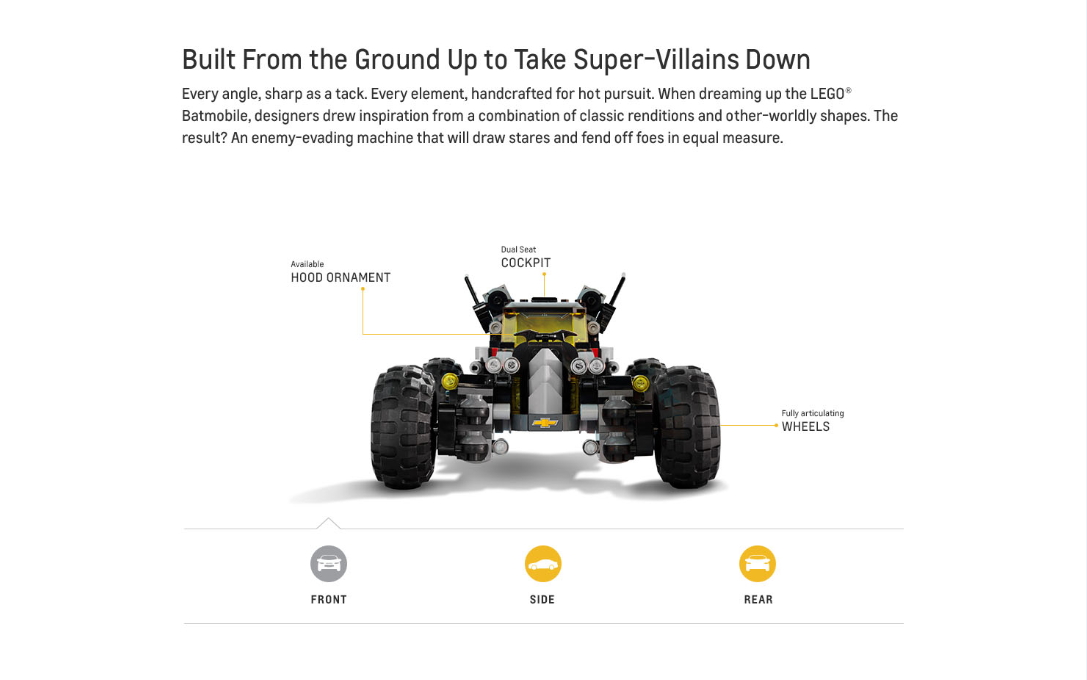 Stretching 17 feet long, the full-scale Lego mockup measures about the length of a Tahoe. Sitting over 9 feet wide and standing nearly 7 feet tall, though, it’s significantly wider and taller. But it only has two seats (perfect for one disguised Bruce Wayne and his ward or love interest), and don’t weigh a third of what one of the Chevy’s actual production SUVs does.