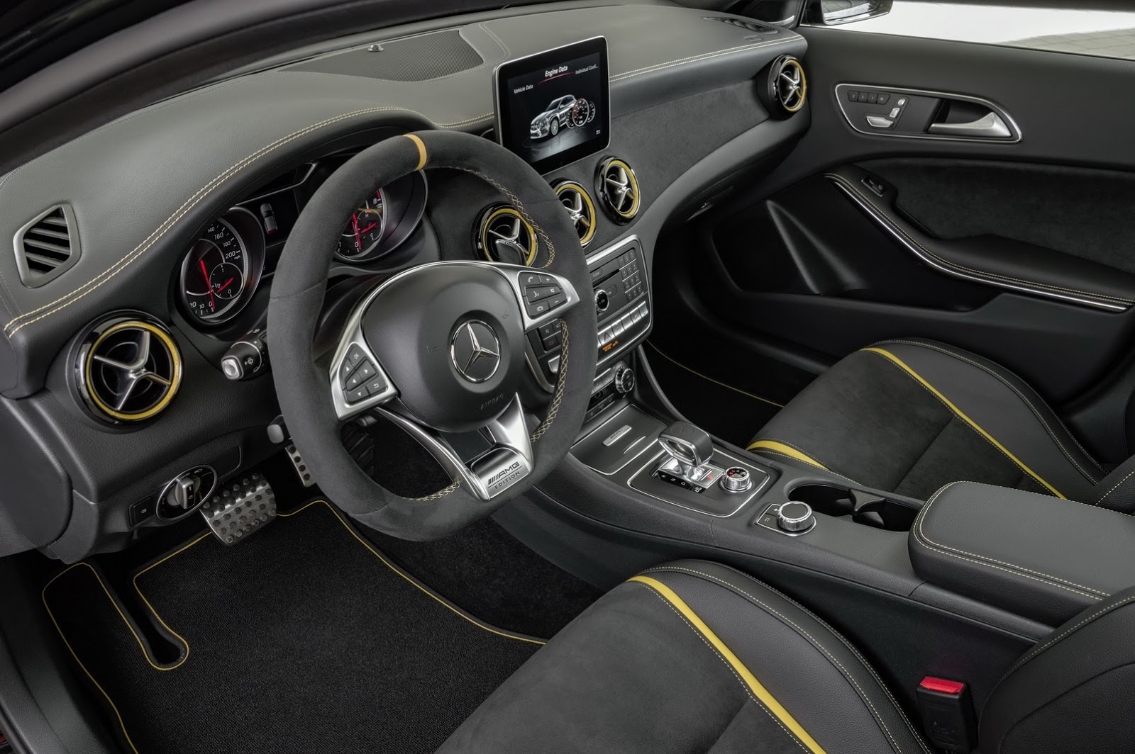 Finally, the GLA 45 4MATIC Yellow Night Edition is priced from £53,135 and is available [the spec] not just on the GLA 45, but also on the A 45, CLA 45 and CLA 45 Shooting Brake. Standard features include the AMG aerodynamics pack, AMG Night pack, 20″ AMG 10-spoke alloys with yellow-painted rims, body styling with yellow accents on the diffuser, rear wing and mirror housings, cosmos black metallic paint, Keyless-Go Comfort pack, AMG performance steering wheel in Nappa leather and Artico leather upholstery with yellow highlight stripes.