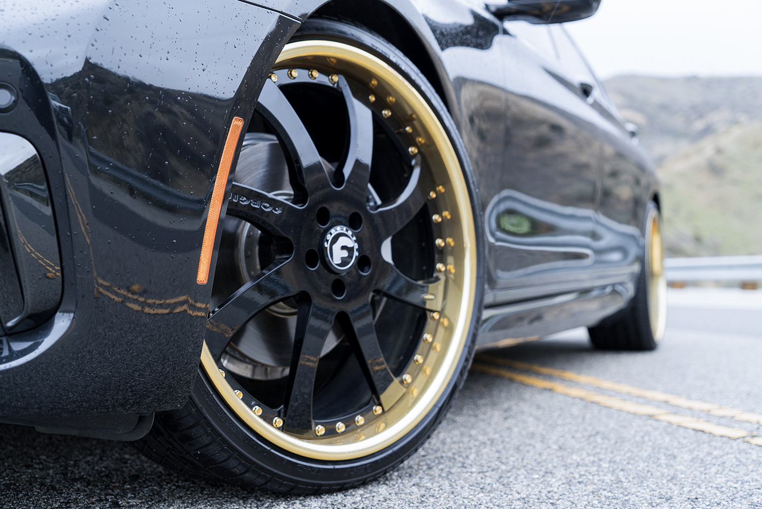 The Quattresimo wheels are crafted from aircraft grade forged aluminum and can be ordered in a multitude of forging options like concave, step lip, convex or anything in between. There are also plenty of customization options for the finish, such as carbon, brushed, or in this case, black spokes with a gold lip, to match the gold finish on the grille.