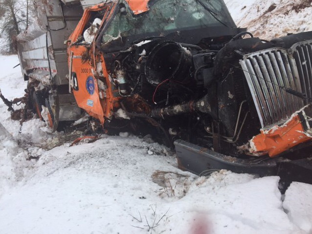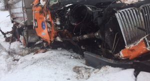 In the video below, you can see Terry Jacobson’s (on the job for 20 years) snow plow getting clipped by the semi, darting towards incoming traffic and eventually winds up going down a 300-foot (91 meter) embankment.