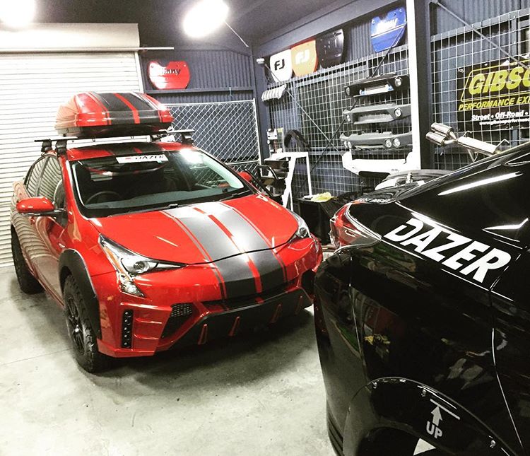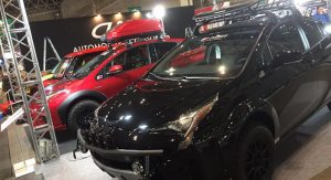 What we have here is a Prius wearing a Dazer conversion by Car-Style, which as you can see, adds a 50mm suspension lift, plastic over-fenders, new bigger wheels with off-road tires, new front and rear bumpers with guards and a rugged roof rack.