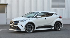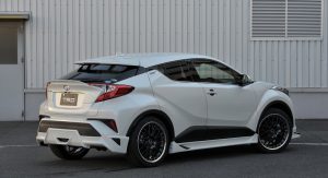 The “aggressive” version of the C-HR comes with a custom front bumper, LED daytime running lights, custom rear diffuser, extended side skirts for a track-focused look, and a lip spoiler on the tailgate.