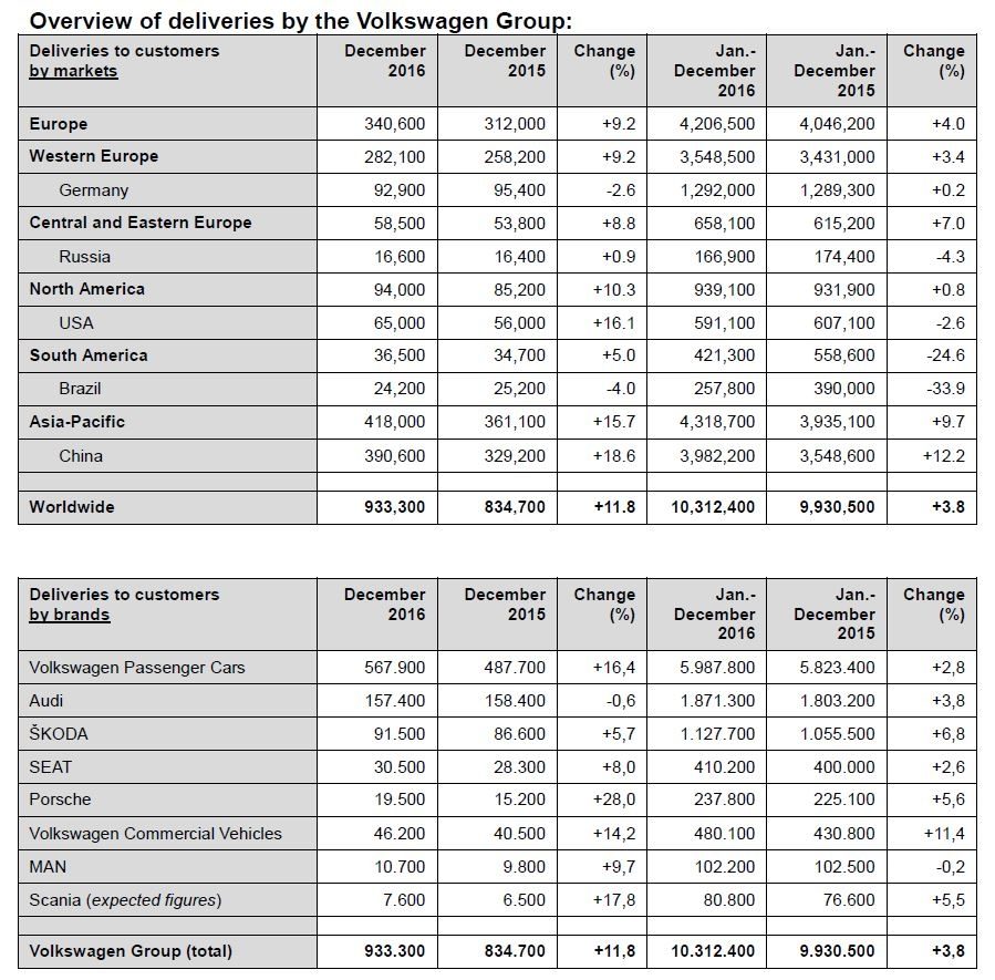 With 10.3 million vehicles delivered worldwide in 2016, the Volkswagen Group recorded a 3.8 percent increase in sales compared to the year before.