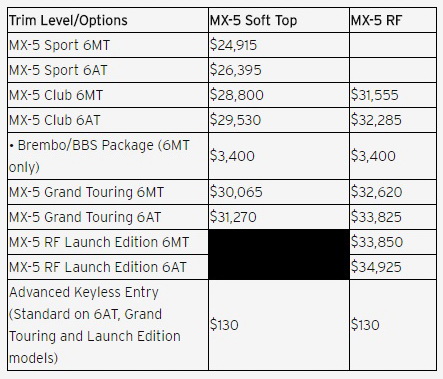 The rest of the package remains as is, with the 2017 MX-5 retaining its $24,915 MSRP base price and customers being offered the choice between three trim levels: Sport, Grand Touring and Club.