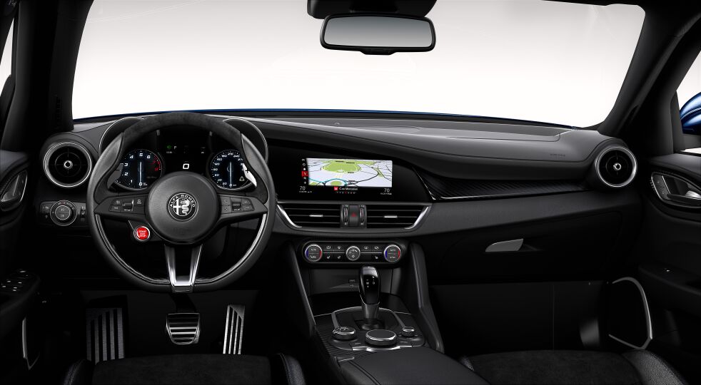 As for the range-topping Giulia Quadrifoglio, the model you’ll inevitable customize with the tool, seven different exterior paint options are available including Rosso Competizione Tri-Coat (the launch color) and our personal favorite, Montecarlo Blue Metallic.