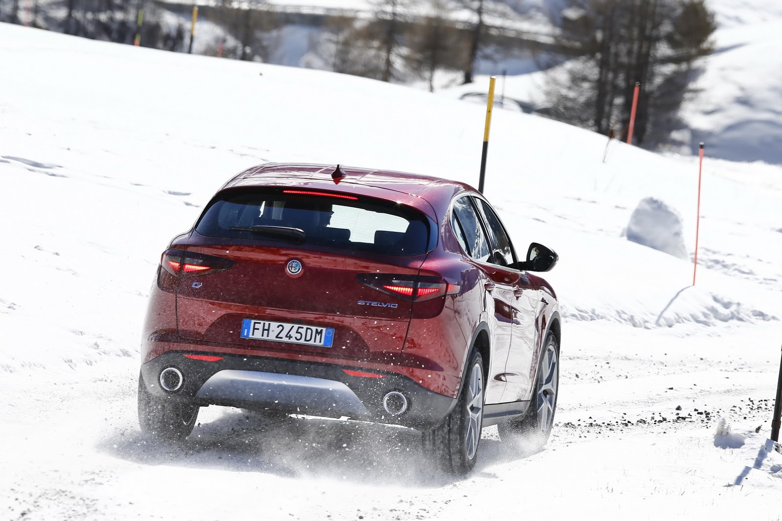 The Q4 all-wheel drive system turns the Stelvio into a rear-wheel drive vehicle with 100% of the torque sent to the rear axle during normal conditions. As grip fades, the system transfers up to 50% of torque to the front axle for best-in-class control in terms of traction and directional stability, according to Alfa Romeo.