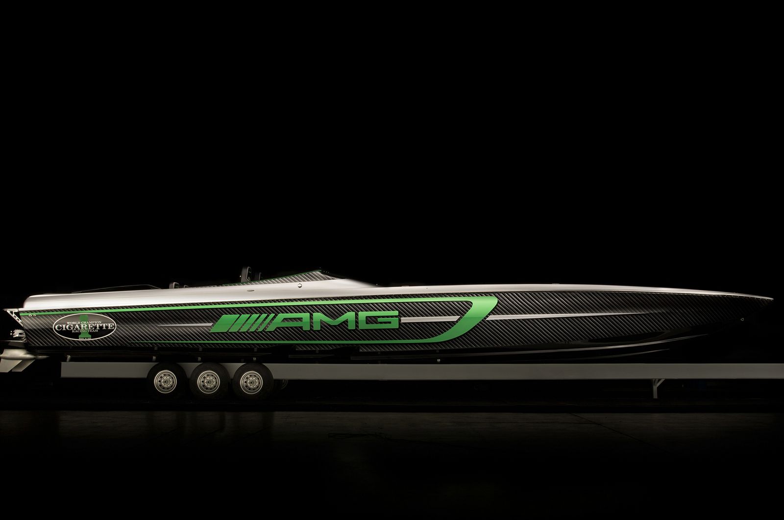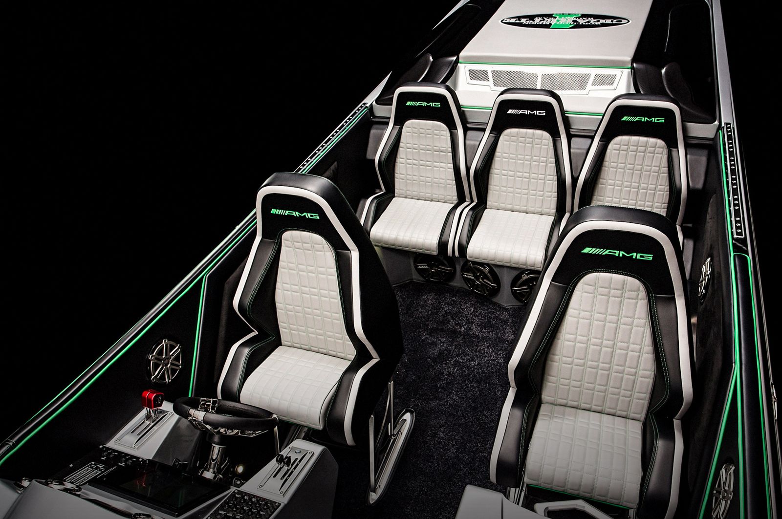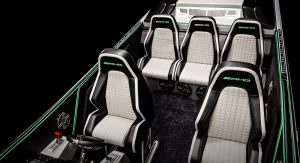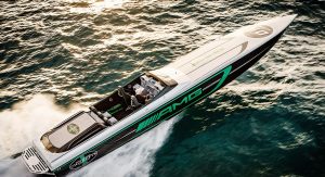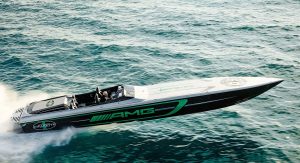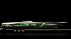 To make the Marauder’s relationship with the GT R immediately apparent, the Cigarette Racing Team enlisted Daimler’s chief design officer, Gorden Wagener, to design the paint and detailing. The interior has also been crafted by the AMG Performance Studio. The boat also features the same Green Hell Magno paint as the GT R.